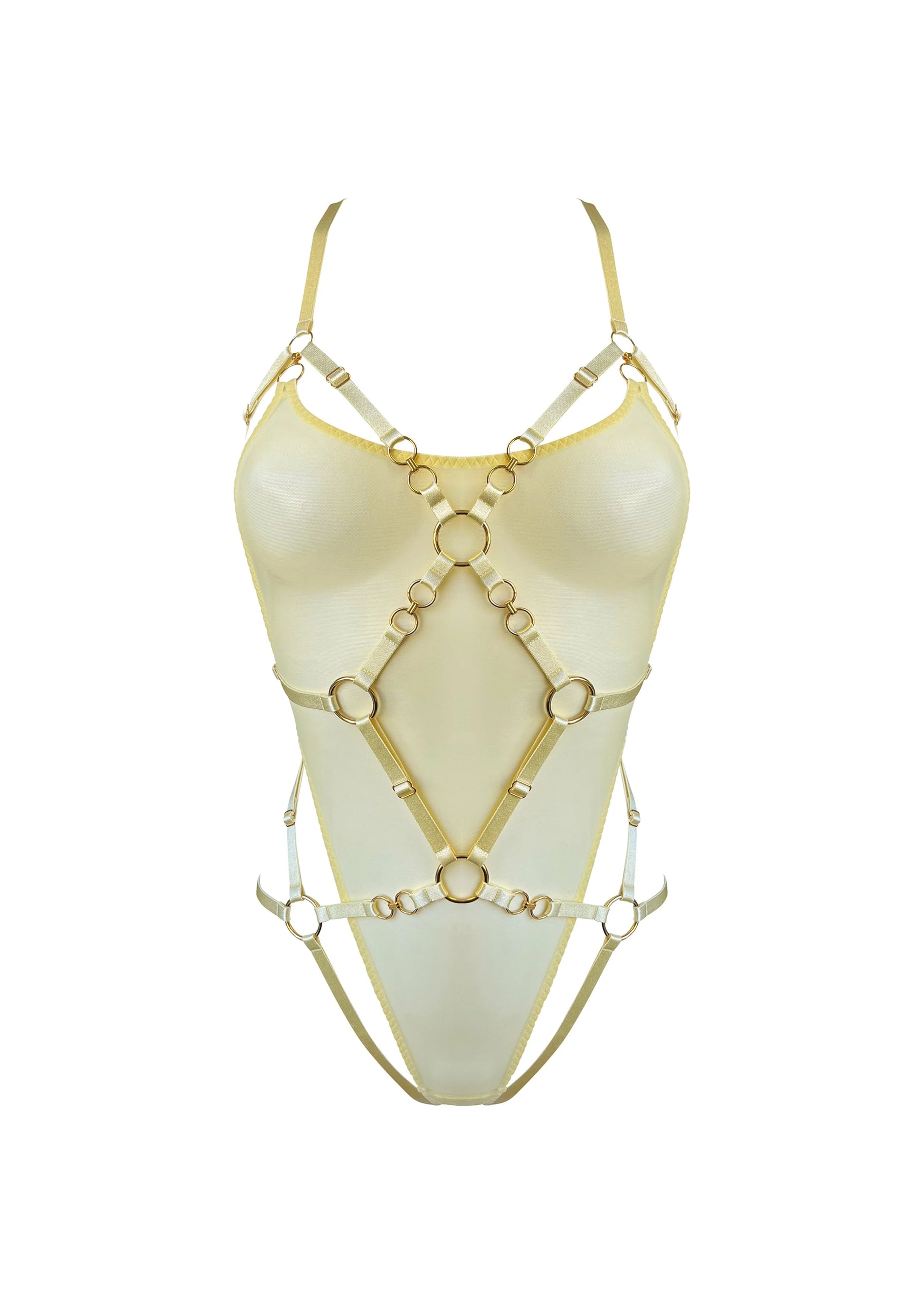 Captivate in the Kleio Multi-Style Harness Body. Displaying our new 24k gold plated chain-link component. this versatile piece features a detachable mesh body which is secured to rings on the harness via 24k gold plated ring hooks. Wear the elastic harness solo or with the accompanying mesh body panel. An Essential style; now available in limited edition colourways.